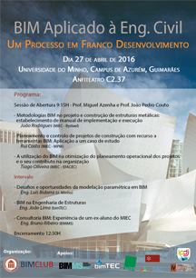 No próximo dia 27 de Abril realizar-se-ão no campus de Azurém da Universidade do Minho, diversas apresentações, de projetos desenvolvidos no âmbito de Dissertações de Mestrado de alunos do Mestrado Integrado em Engenharia Civil da Universidade do Minho (MIEC), e também apresentações de representantes de empresas nas quais os BIM está presente no seu quotidiano.