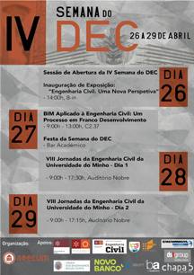 Nos próximos dias 26 a 29 de Abril será realizada a IV edição da Semana do Departamento de Engenharia Civil da Universidade do Minho, organizada pela Associação de Estudantes de Engenharia Civil da Universidade do Minho (AEECUM) com o apoio da Direção de Departamento e da Direção de Curso. A Semana do DEC é um evento anual com várias atividades desenvolvidas no sentido de divulgar o curso de Engenharia Civil da Universidade do Minho e as potencialidades da área, as quais passam despercebidas à população geral. É também uma forma de os alunos conhecerem diferentes vertentes da área, com as quais podem ter um contato menor durante o seu percurso académico. Este evento é aberto a profissionais, empresas e investigadores, assim como a estudantes das várias instituições de ensino superior do país num ambiente de aprendizagem, troca de conhecimentos e experiências. Também nesta edição da semana do DEC está presente um evento inteiramente ligado ao BIM.